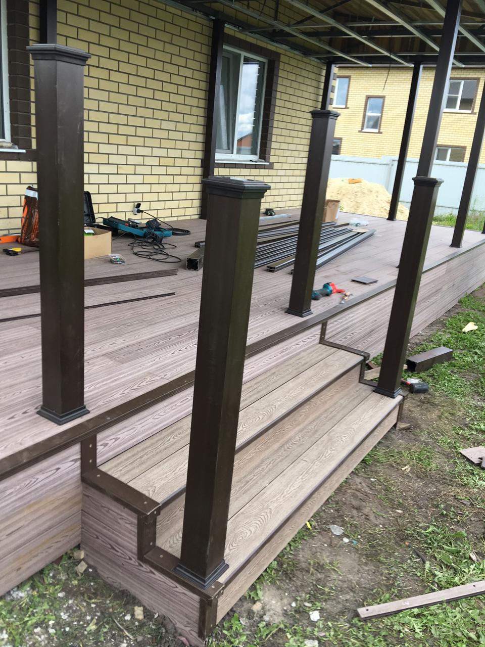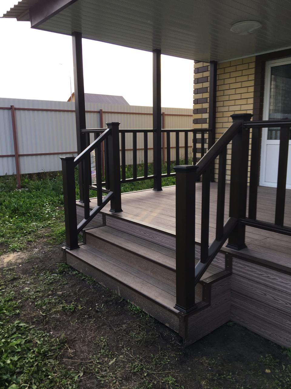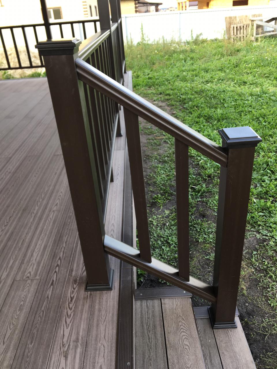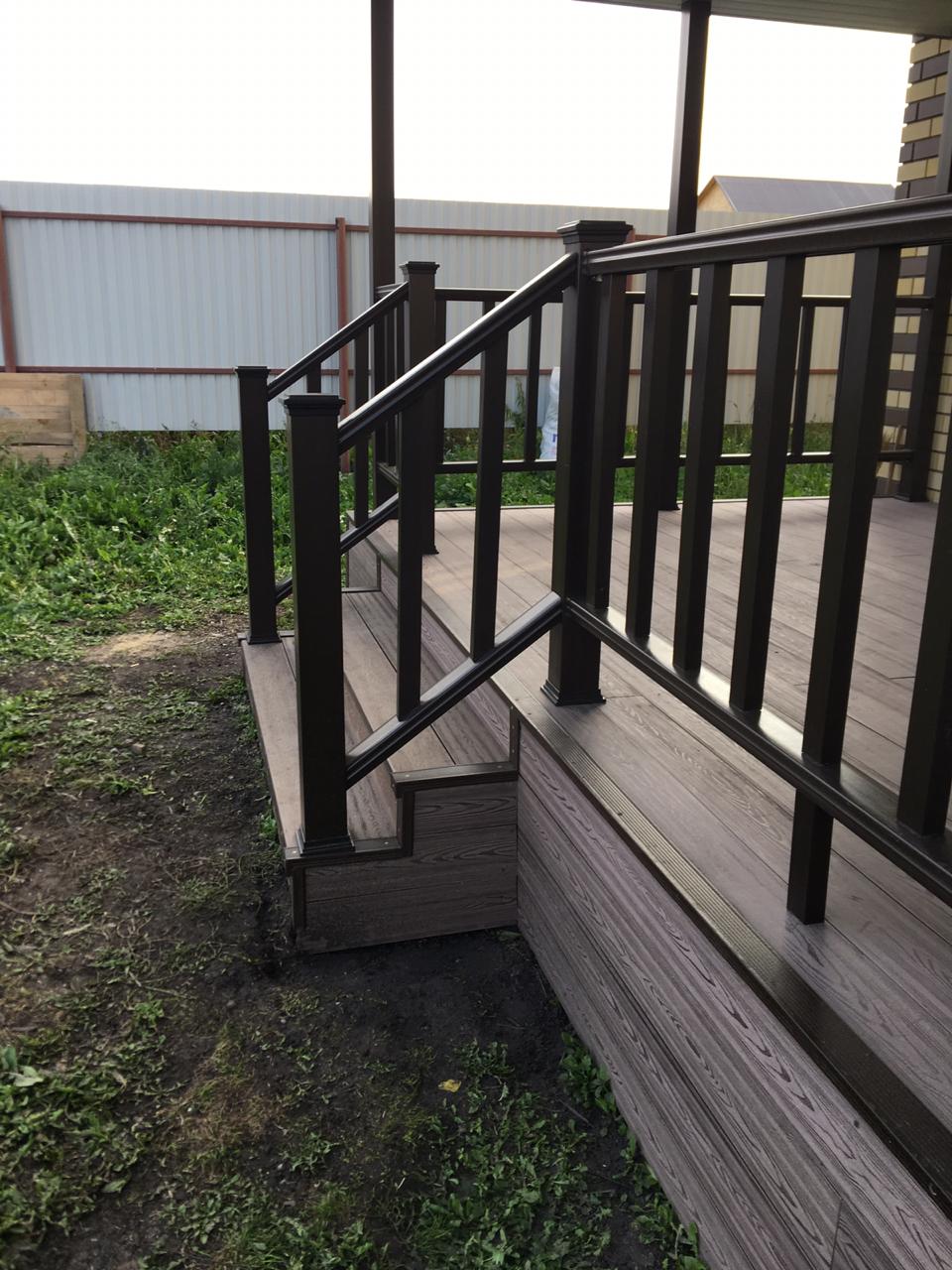 Ограждения и перила лесенки также марки Holzhof. Особенностью монтажа ограждений из ДПК Holzhof стало то, что трехметровый профиль был надет на металлические столбы-опоры прямо до потолка крыши, что придало всем ограждениям единый стиль цвета венге и органично вписалось в архитектуру дома.